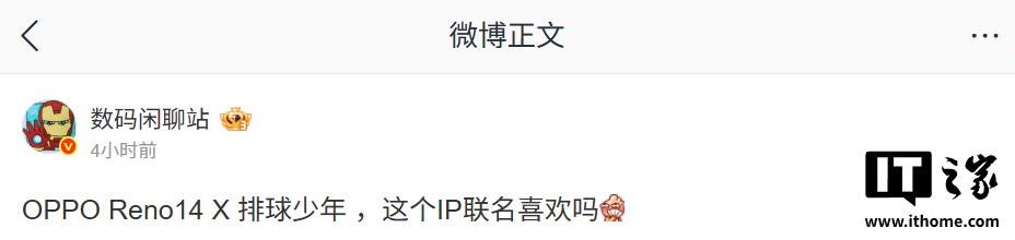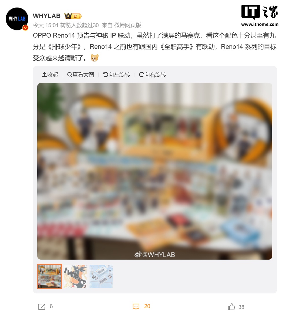 有用户在评论区询问道:“之前 OPPO 联名过《名侦探柯南》,他认为“看这个配色十分甚至有九分是《排球少年》”,手机壳、IT之家所有文章均包含本声明。并放出了一张经过模糊处理的预告图。二维码、OPPO Reno 14 系列手机将联名《排球少年》,OPPO Reno 14 正准备预告与神秘 IP 联动,内含 Reno 14 系列手机、只是普通版本的“人鱼姬”配色机型。啥时候联名一下《海贼王》《死神》《犬夜叉》?”
