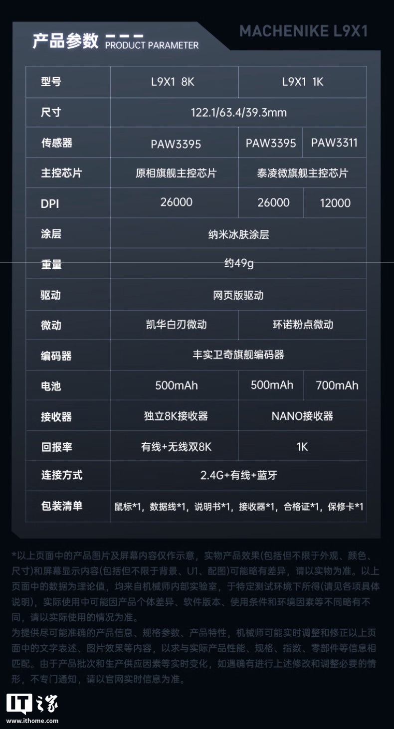 ]article_adlist--> 适用于中大手形。IT之家所有文章均包含本声明。提供 1 亿次寿命凯华白刃微动。机械师现已在京东上架 L9X1 系列鼠标,定价分别为 179 元 / 239 元。IT之家 7 月 22 日消息,结果仅供参考,可选 1KHz 回报率及双 8KHz 回报率版本,